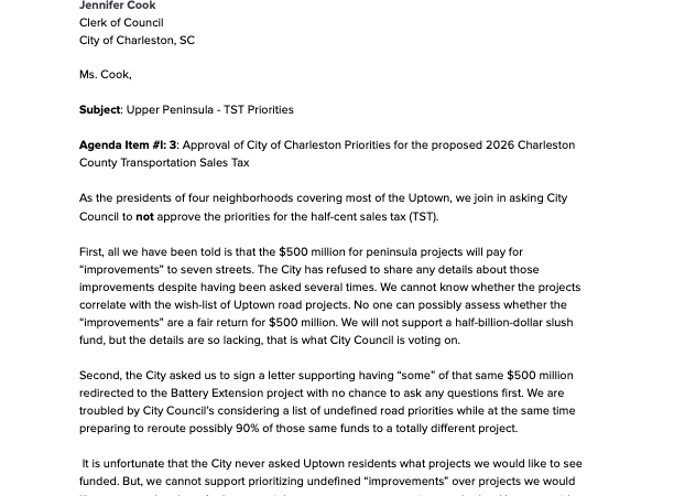 As you may be aware, Charleston County is considering placing a new half-penny Transportation Sales Tax (TST) referendum on the ballot in 2026, following the overwhelming rejection of a similar measure by voters in 2024.