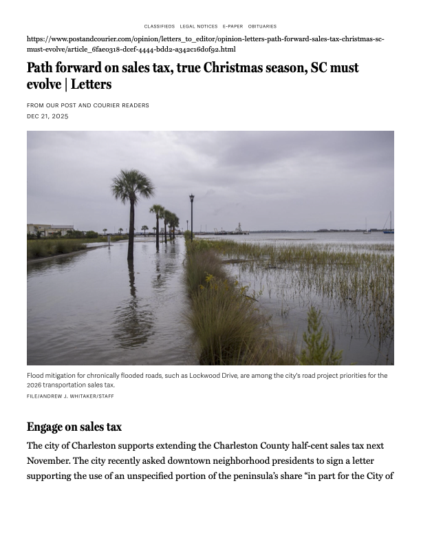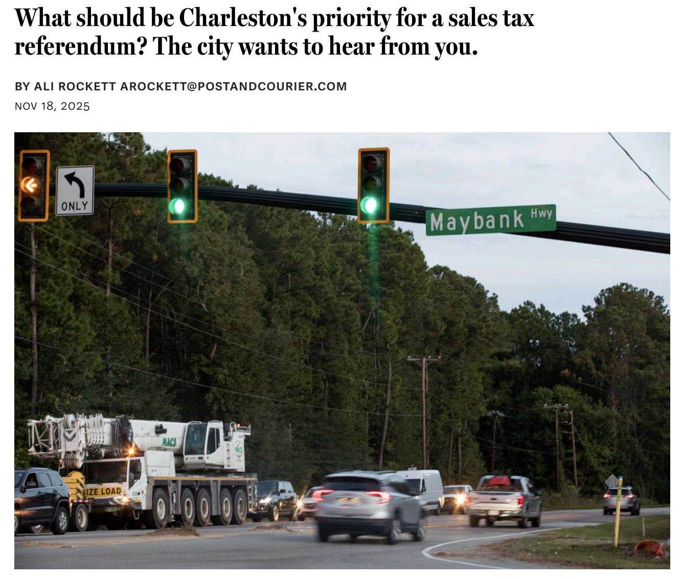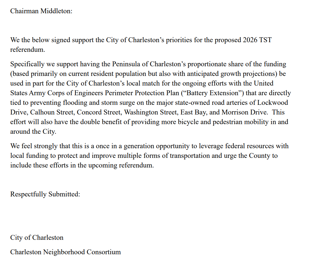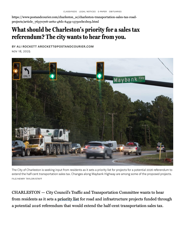As you may be aware, Charleston County is considering placing a new half-penny Transportation Sales Tax (TST) referendum on the ballot in 2026, following the overwhelming rejection of a similar measure by voters in 2024.