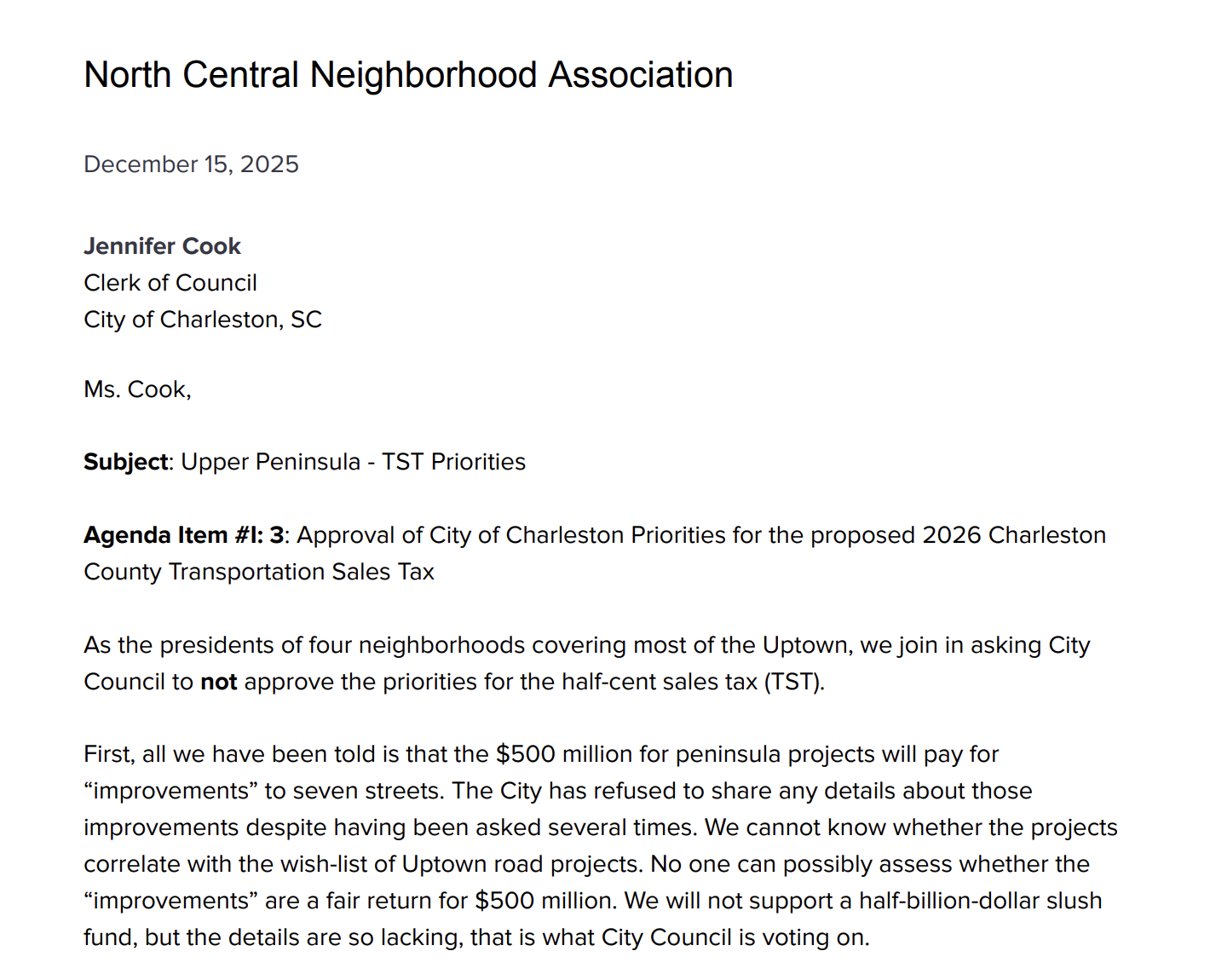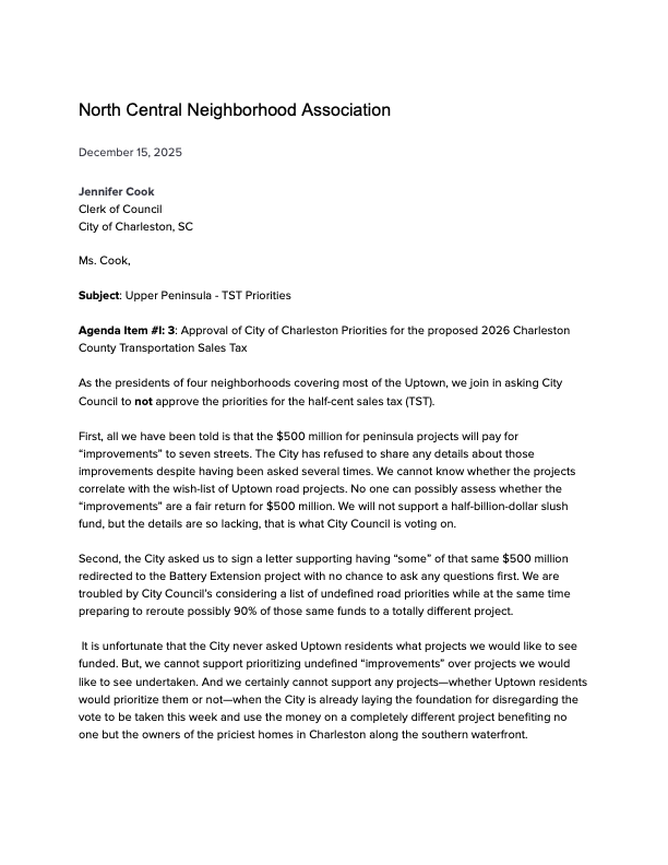 Though my fellow Upper Peninsula presidents and I, in principle, support an extended seawall to help protect Charleston for future generations, we were concerned that a lack of detail meant most or even all of any TST funds allocated to the peninsula would go towards the seawall, leaving other important and longstanding priorities elsewhere on the peninsula neglected.